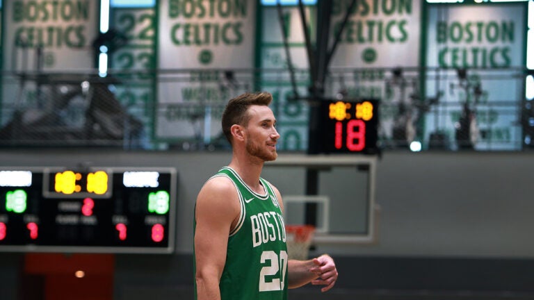 Boston, MA 13/09/18 O Celtics Gordon Hayward se encontrou com a mídia nas instalações do time em Brighton para atualizar sua condição enquanto ele se recupera da lesão no tornozelo/pé esquerdo que sofreu durante o jogo de abertura da temporada passada em Cleveland. Ele é retratado enquanto caminha pela quadra após uma sessão de fotos. Jim Davis / Equipe Globe