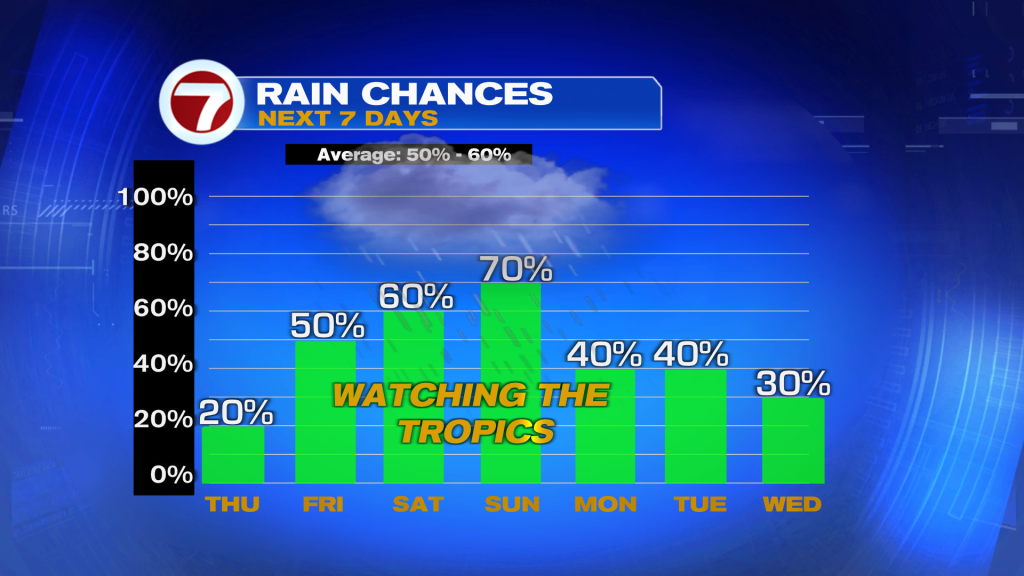 Ao encerrarmos a semana, há chances de algumas tempestades, mas as chances de chuva devem aumentar no fim de semana e tudo dependerá do que acontecer com uma onda tropical.