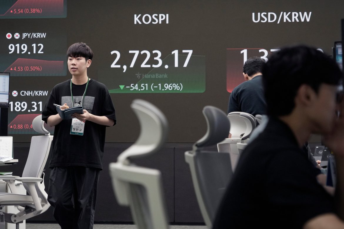 Um operador de câmbio observa monitores perto da tela que mostram o Índice de Preços de Ações Composto da Coreia (KOSPI), à esquerda, e a taxa de câmbio entre o dólar americano e o won sul-coreano na sala de negociação de câmbio da sede do KEB Hana Bank em Seul, Coreia do Sul, sexta-feira, 2 de agosto de 2024. (Foto AP/Ahn Young-joon)