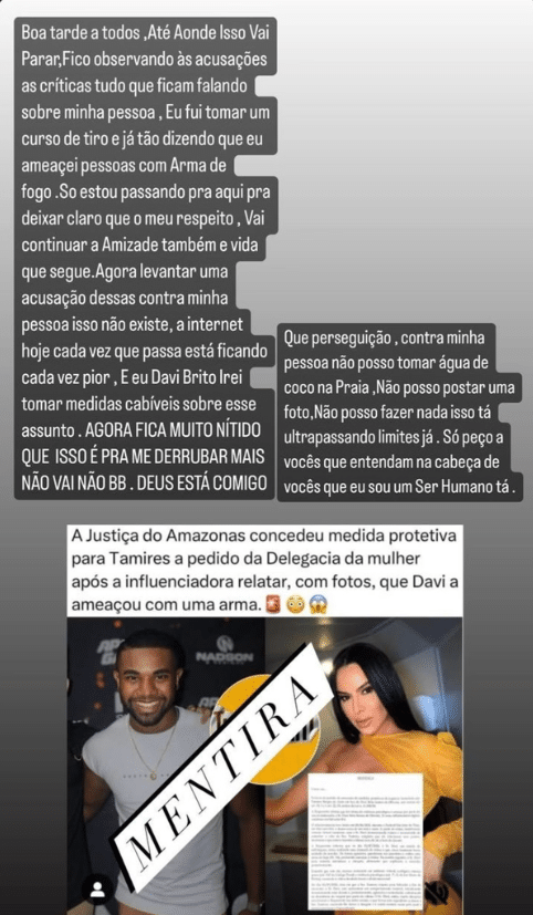 Outra questão levantada recentemente foi a notícia de que Tamires Brito teria solicitado uma medida protetiva contra Davi. Esta informação foi desmentida pela equipe jurídica do ex-BBB, que classificou as reportagens como falsas.
