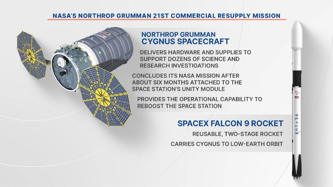 Uma nave espacial de carga Northrop Grumman Cygnus fará a viagem a bordo de um foguete SpaceX Falcon 9 para entregar mais de 8.200 libras de suprimentos ao laboratório orbital e permanecerá acoplada a ele por cerca de seis meses.