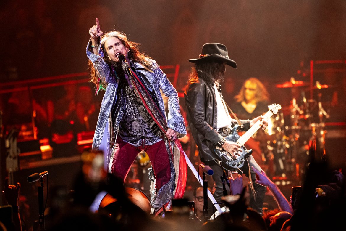 Steven Tyler, Tom Hamilton, Joey Kramer, Joe Perry e Brad Whitford com o Aerosmith chegam durante o Bud Light Super Bowl Music Fest Day 2 na State Farm Arena na sexta-feira, 1º de fevereiro de 2019, em Atlanta. (Foto de Robb Cohen/Invision/AP)Robb Cohen/Invision/AP