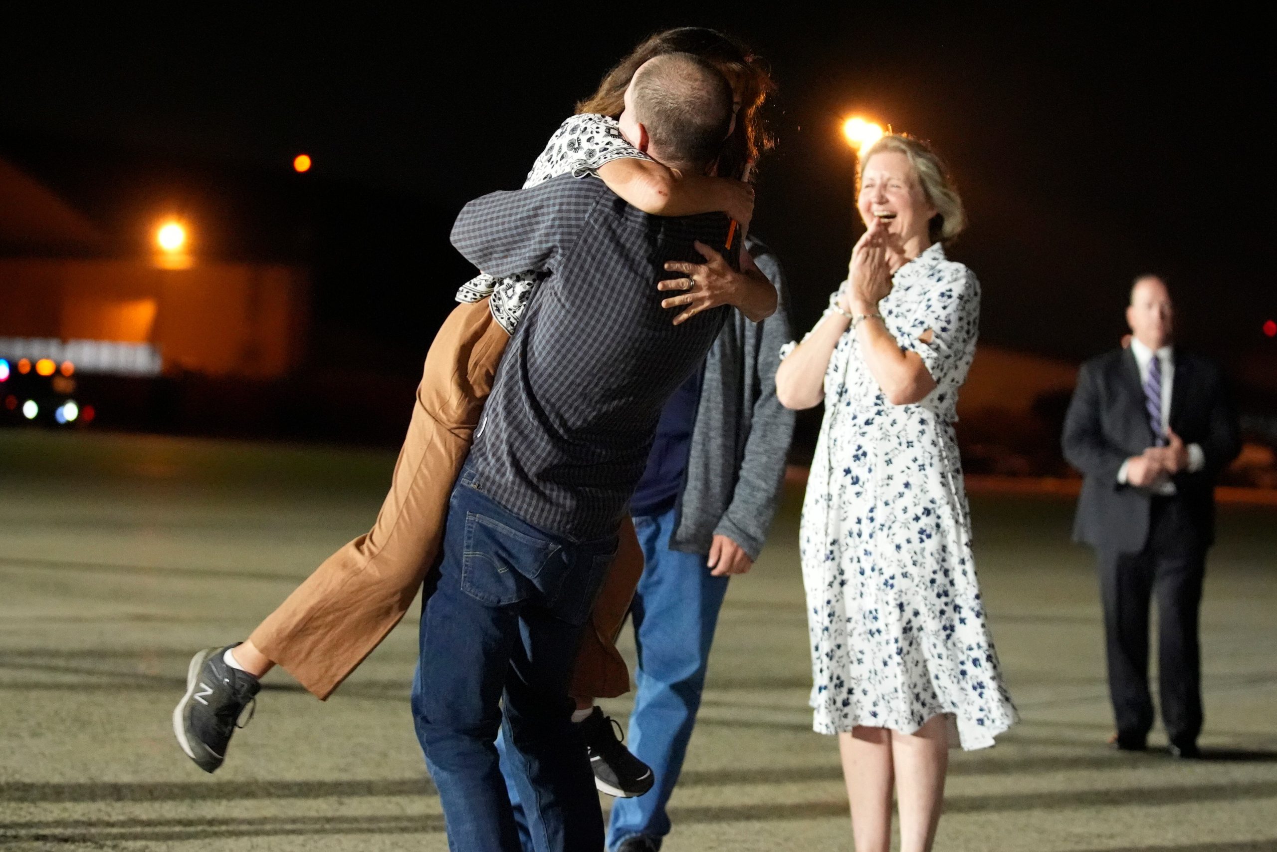 ARQUIVO – O presidente Joe Biden, da esquerda para a direita, e a vice-presidente Kamala Harris cumprimentam o repórter Evan Gershkovich na Base Aérea de Andrews, Maryland, após sua libertação como parte de uma troca de prisioneiros de 24 pessoas entre a Rússia e os Estados Unidos, em 1º de agosto de 2024. A Bloomberg News está se desculpando por uma história prematura escrita sobre a troca de prisioneiros e diz que disciplinou os jornalistas envolvidos. A história foi publicada pela Bloomberg horas antes de um embargo ser levantado pela Casa Branca. (AP Photo/Manuel Balce Ceneta, Arquivo)