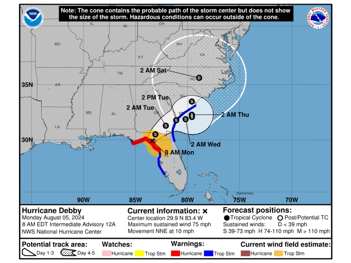 Debby traz consigo o potencial para chuvas recordes, inundações catastróficas e tempestades com risco de vida, à medida que se move lentamente pela parte norte do estado. Depois disso, espera-se que pare sobre as regiões costeiras da Geórgia e Carolina do Sul, que podem ver até 30 polegadas de chuva.
