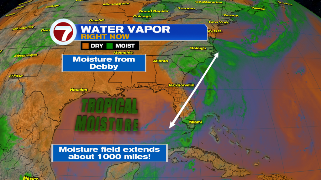 O campo de umidade de Debby se estende por cerca de 1.000 milhas e a cauda está nos deixando com uma chance de ver chuvas e tempestades hoje. Na verdade, uma chance um pouco maior do que ontem.