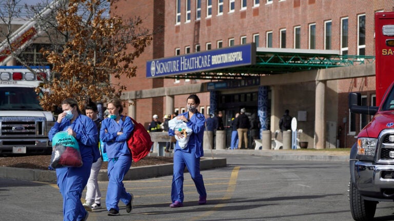 Equipe médica se afasta da entrada do Signature Healthcare Brockton Hospital, terça-feira, 7 de fevereiro de 2023, em Brockton, Massachusetts. (Foto AP/Steven Senne)