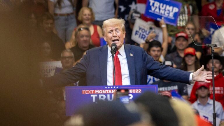 O ex-presidente dos EUA e candidato presidencial republicano Donald Trump discursa durante um comício de campanha eleitoral em Bozeman, Montana, em 9 de agosto. Natalie BEHRING / AFP