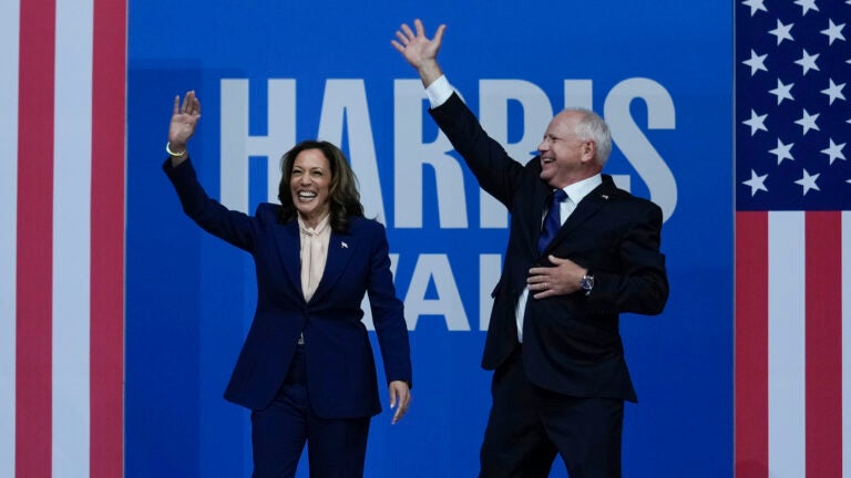 A candidata presidencial democrata, vice-presidente Kamala Harris, e seu companheiro de chapa, o governador de Minnesota, Tim Walz, chegam a um comício de campanha na Filadélfia, terça-feira, 6 de agosto de 2024. Foto AP/Matt Rourke