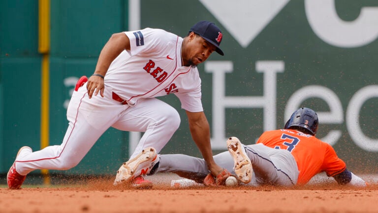 A marcação de Enmanuel Valdez em Jeremy Peña, do Houston, ocorreu no final do quinto inning no domingo. Matthew J Lee/Equipe Globe