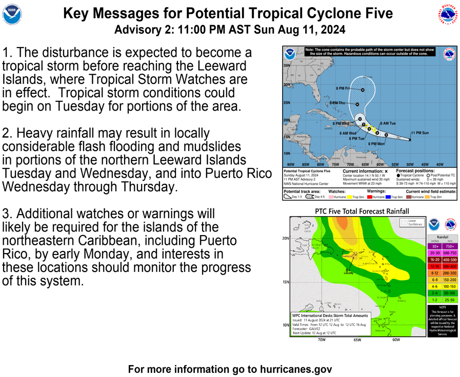 Também estamos observando o futuro Ernesto. Isso impactará o clima no nordeste do Caribe por todo o caminho através de Porto Rico antes de virar para o norte em direção às Bermudas esta semana.
