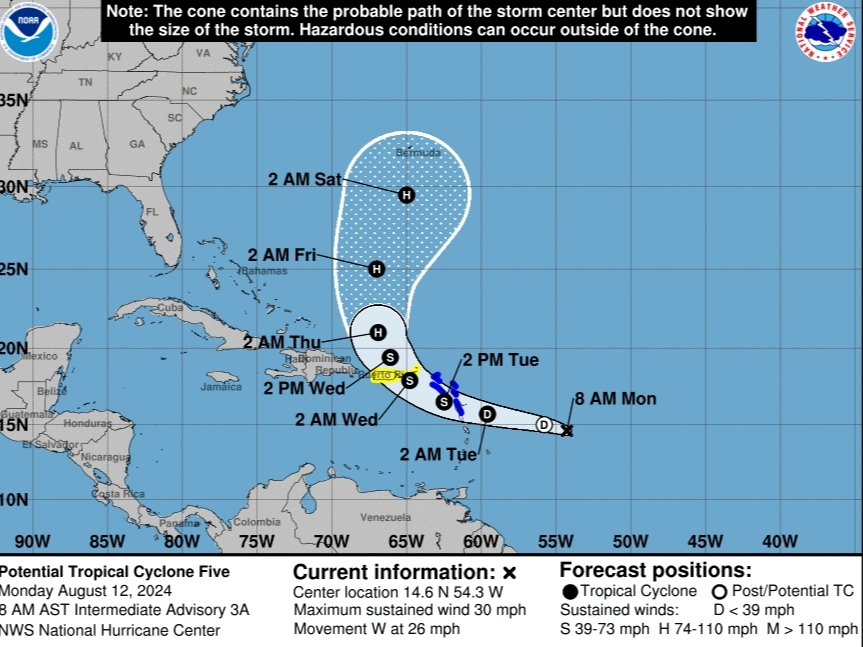 FLÓRIDA — Um alerta de tempestade tropical foi emitido para Porto Rico e ilhas próximas enquanto o potencial ciclone tropical cinco se move pelo Atlântico na manhã de segunda-feira, de acordo com o Centro Nacional de Furacões.