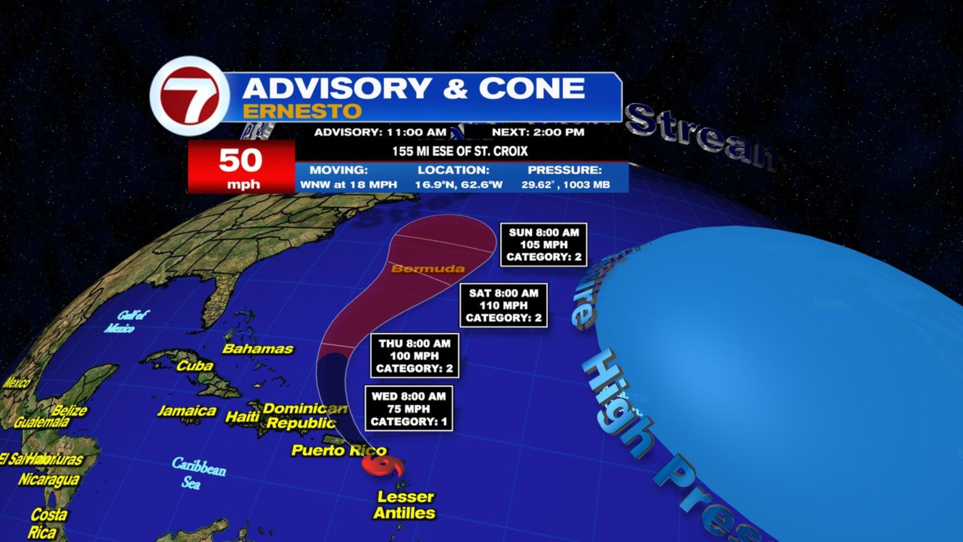 Ernesto estava localizado a cerca de 155 milhas (250 quilômetros) a leste-sudeste de St. Croix na manhã de terça-feira. Ele tinha ventos máximos sustentados de 50 mph (85 km/h) e estava se movendo para oeste-noroeste a 18 mph (30 km/h).