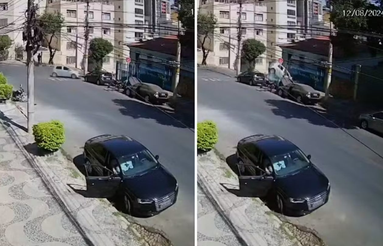 O incidente aconteceu no fim da manhã, quando o carro, dirigido pela idosa, desceu a rua Almirante Alexandrina em alta velocidade, atingindo a grade da casa na esquina com grande impacto. As imagens das câmeras de segurança são chocantes e mostram o momento exato da colisão, que foi tão intensa que a traseira do veículo levanta do chão.