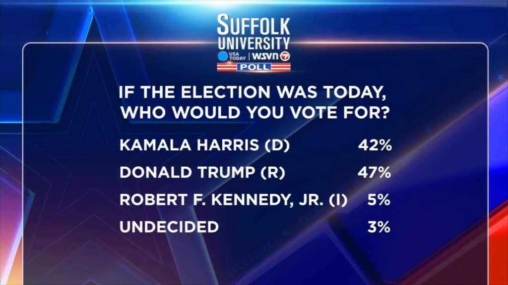 A pesquisa com 500 prováveis eleitores da Flórida descobriu que, se a eleição de 2024 fosse realizada hoje, o ex-presidente Donald Trump obteria 47% dos votos, enquanto a vice-presidente Kamala Harris obteria 42% dos votos.