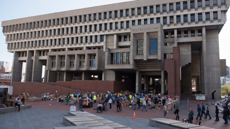 Boston, MA – 1/9/17 – Voluntários de toda Boston correm para separar e embalar suprimentos doados às vítimas do furacão Harvey em Houston, Texas, na Boston City Hall Plaza, na sexta-feira, 1º de setembro de 2017. Nicholas Pfosi para o Boston Globe