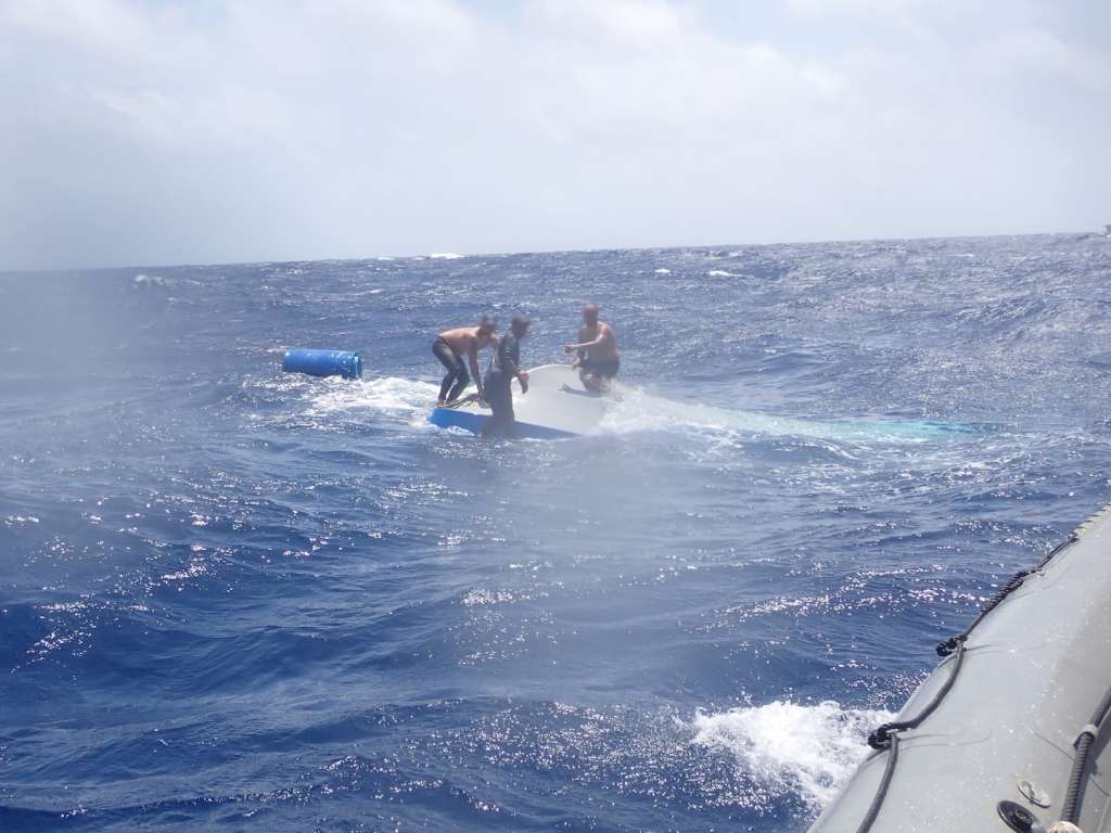 Uma equipe combinada da Marinha e da Guarda Costeira resgatou três supostos contrabandistas da água e recuperou os fardos de cocaína.