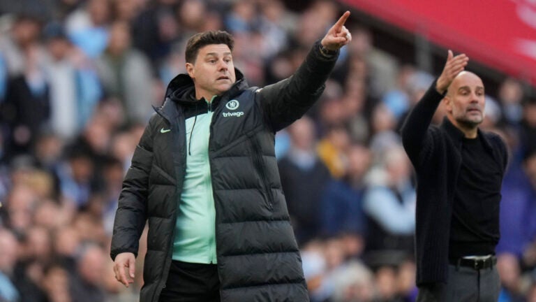 ARQUIVO – O técnico do Chelsea, Mauricio Pochettino, à esquerda, e o técnico do Manchester City, Pep Guardiola, gesticulam durante a partida da semifinal da Copa da Inglaterra entre Manchester City e Chelsea, no estádio de Wembley, em Londres, sábado, 20 de abril de 2024. Alastair Grant / AP Photo, Arquivo