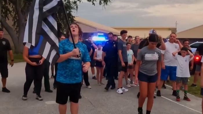O fundador da Running 4 Heroes, Zechariah Cartledge, de 15 anos, correu na pista da Tavares Middle School em sua homenagem.