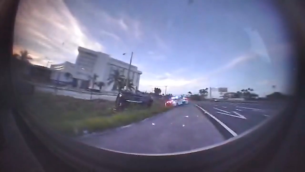 O vídeo da câmera veicular mostra o momento em que o policial deu um fim dramático à perseguição após relatos de um carro roubado em Miami Beach no domingo, 10 de agosto.