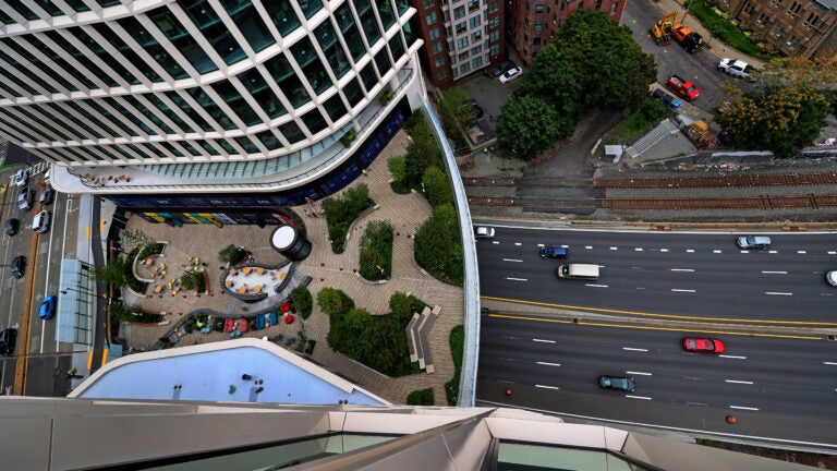 A praça quase concluída, o primeiro grande projeto de direitos aéreos sobre a Massachusetts Turnpike. (David L Ryan/Equipe Globe)