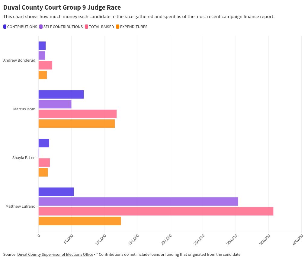 Isom parece estar saindo na frente com $68.772 arrecadados de acordo com os relatórios de financiamento de campanha mais recentes do supervisor eleitoral de Duval. Esse total desconsidera quaisquer empréstimos ou financiamentos que os candidatos tenham dado a si mesmos para apoiar suas campanhas individuais.