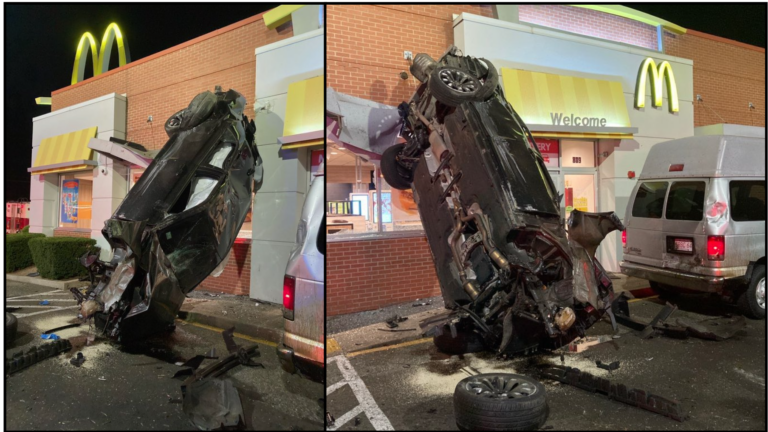 Fotos do acidente divulgadas pelo departamento mostram o porta-malas do carro esmagado contra o toldo do restaurante fast food. O capô dianteiro do carro está apoiado no meio-fio. Cada parte do carro parece estar significativamente danificada, e parece haver destroços espalhados pelo prédio do estabelecimento. O veículo parece estar sem a roda dianteira esquerda inteira, enquanto o teto e as portas apresentam amassados significativos.