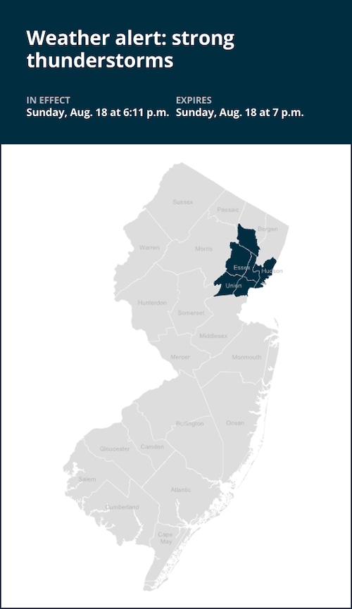 O Serviço Nacional de Meteorologia emitiu um relatório às 18h11 de domingo sobre fortes tempestades até as 19h para os condados de Passaic, Hudson, Essex e Union.