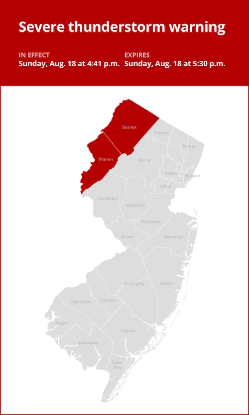 O Serviço Nacional de Meteorologia emitiu um alerta atualizado de tempestade severa às 16h41 de domingo, válido até 17h30 para os condados de Sussex e Warren.