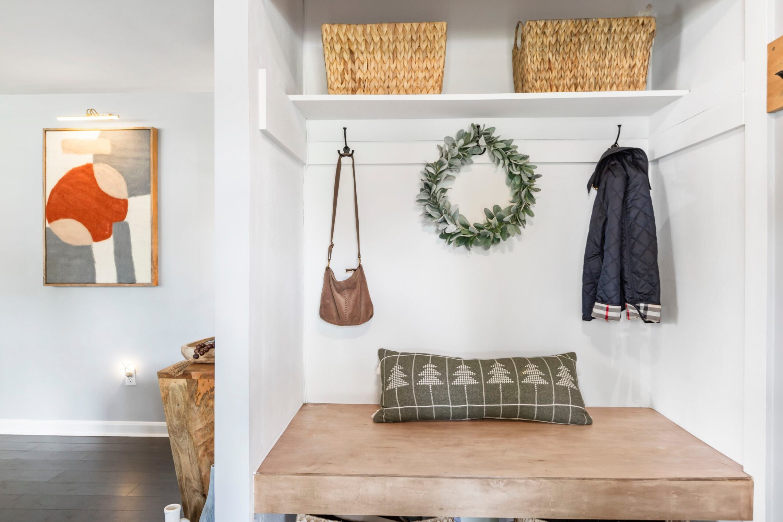 Entre pela porta principal, logo à esquerda da garagem anexa para um carro. Por quê? Há um mudroom com prateleiras abertas, cabideiros e um banco embutido.