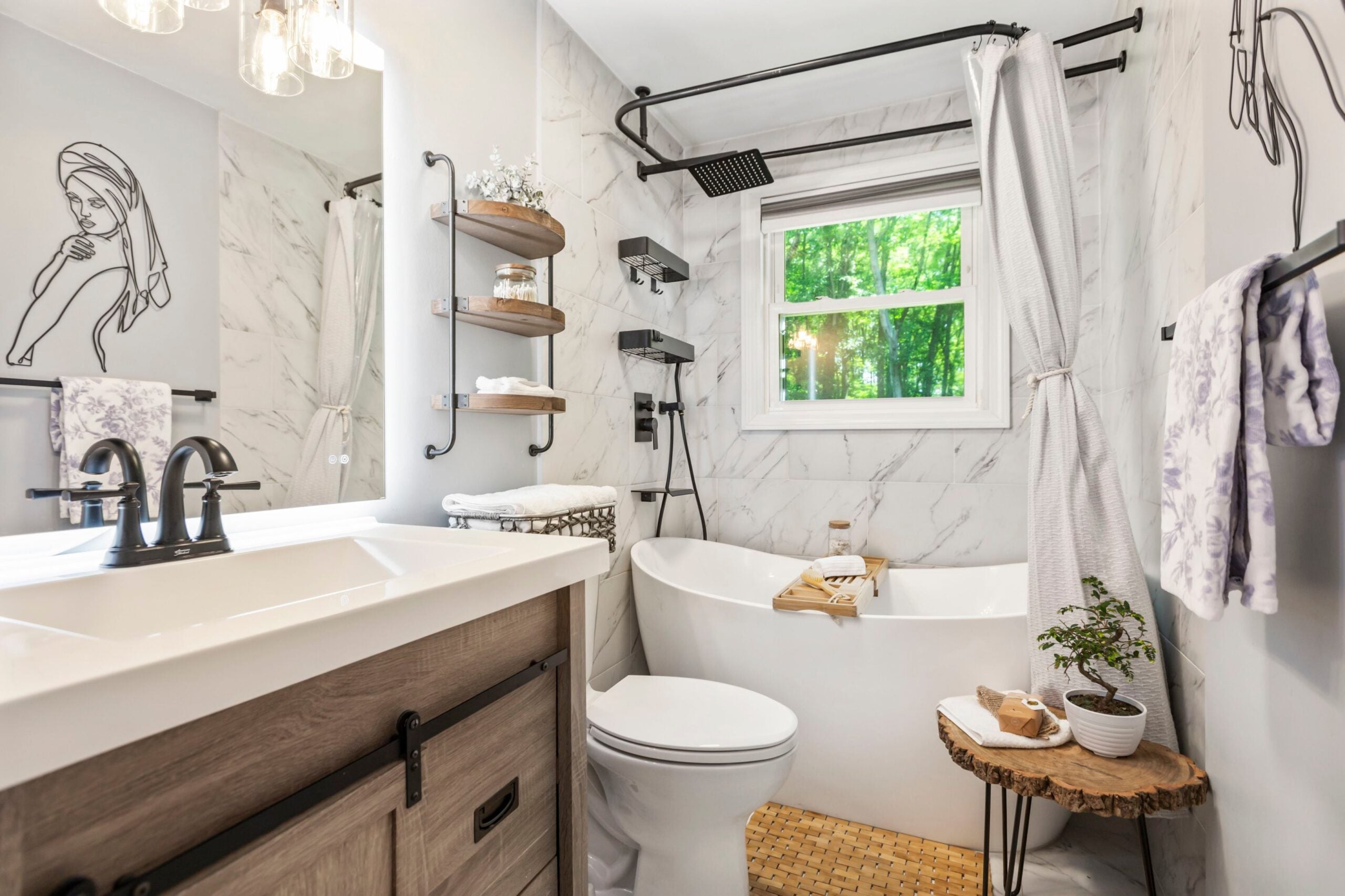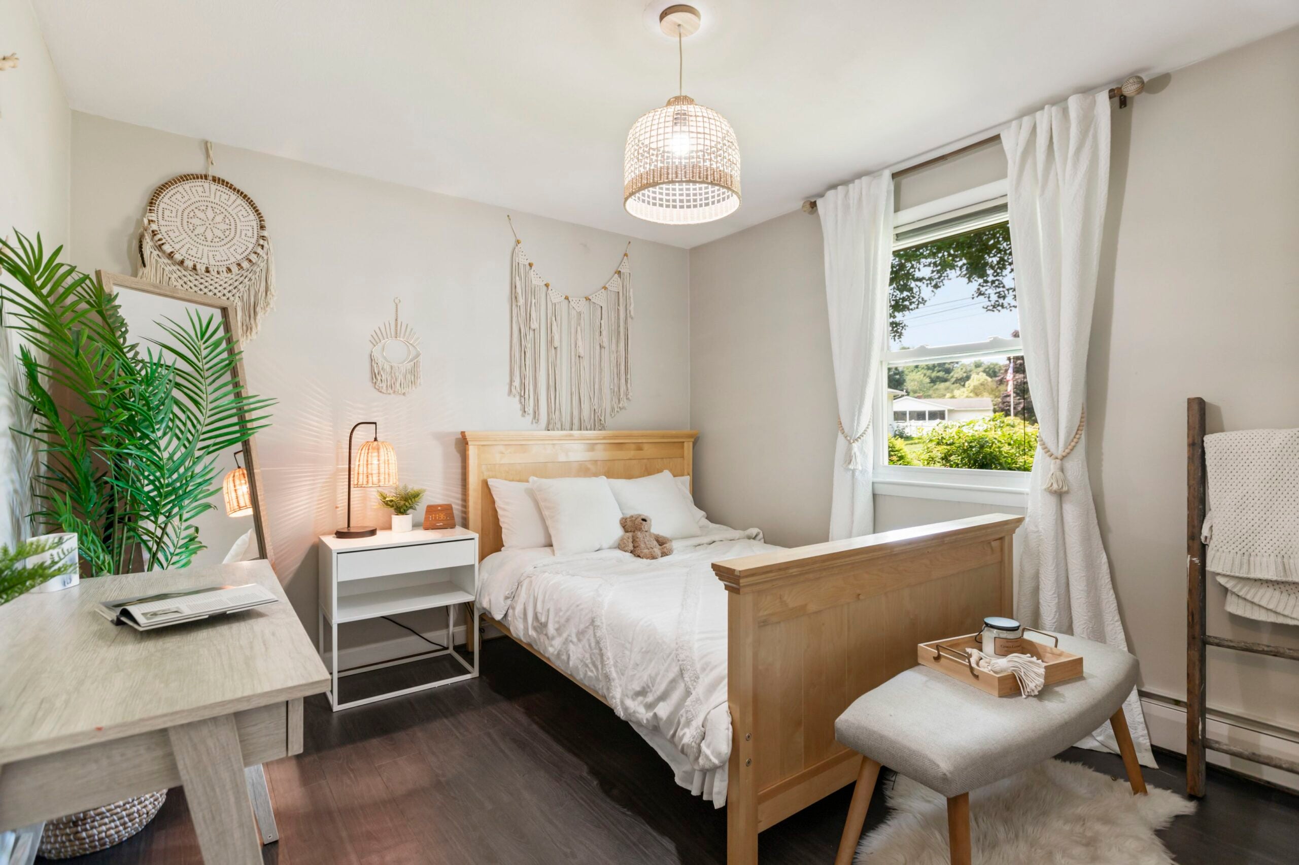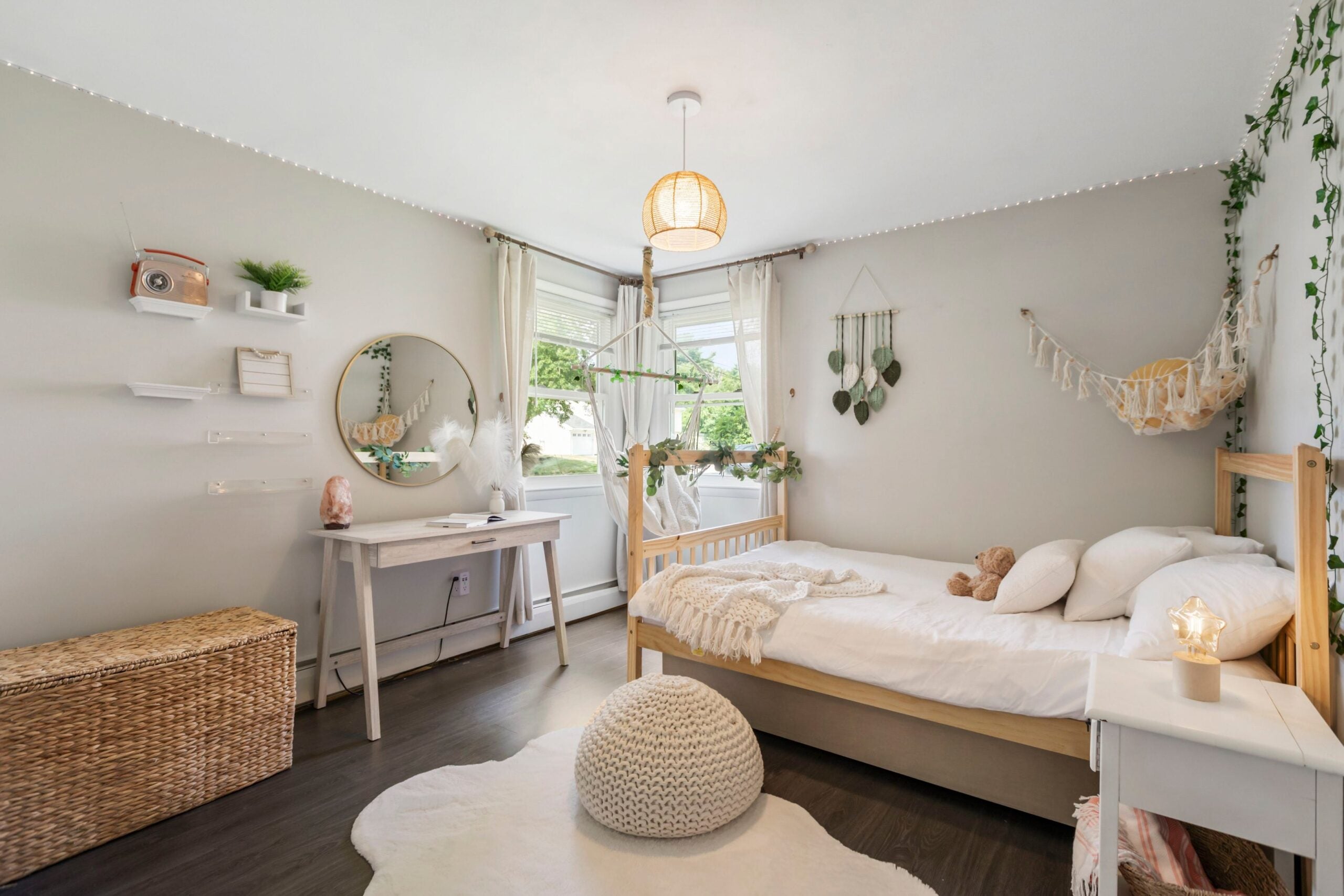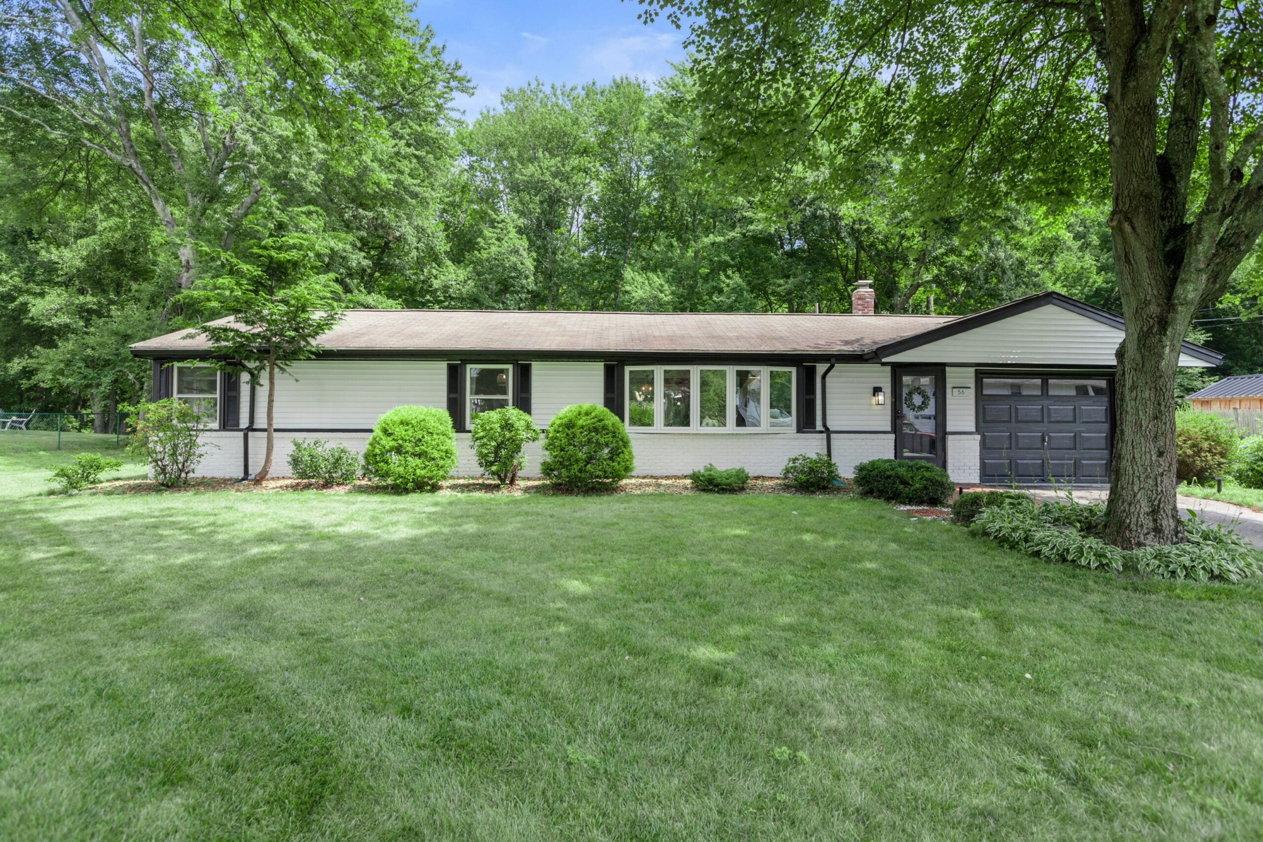 A propriedade fica em pouco menos de um acre e oferece três quartos, dois banheiros completos e uma garagem para um carro. Não se esqueça do balanço de corda.
