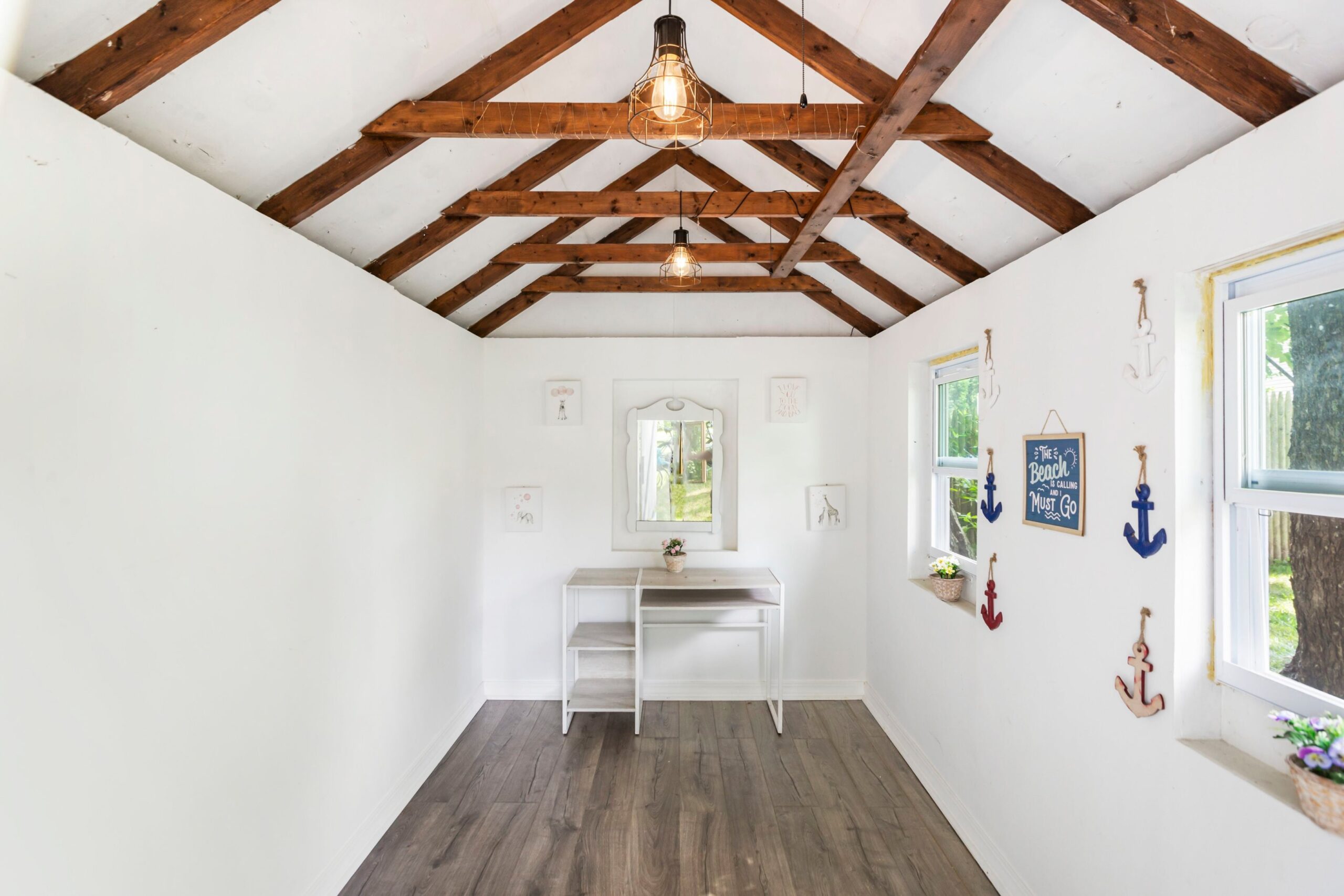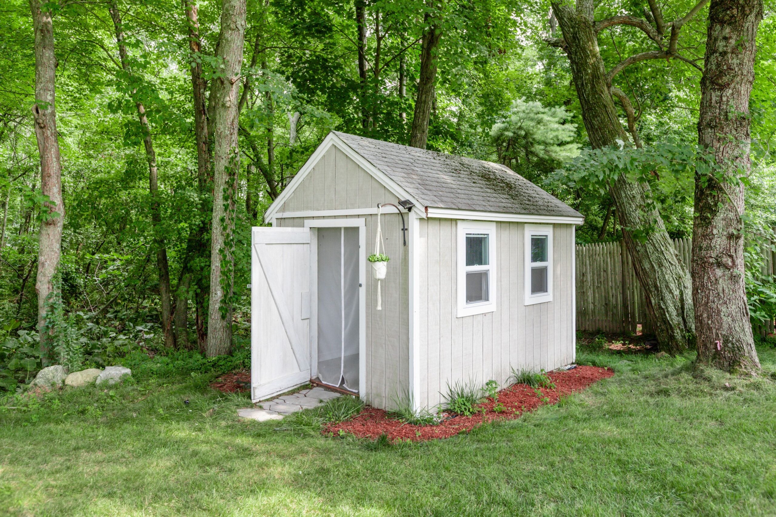 A propriedade vem com dois galpões: um para armazenamento e um “luxuoso” que é finalizado com luzes e piso. Há um balanço de corda no jardim da frente e um pátio nos fundos.