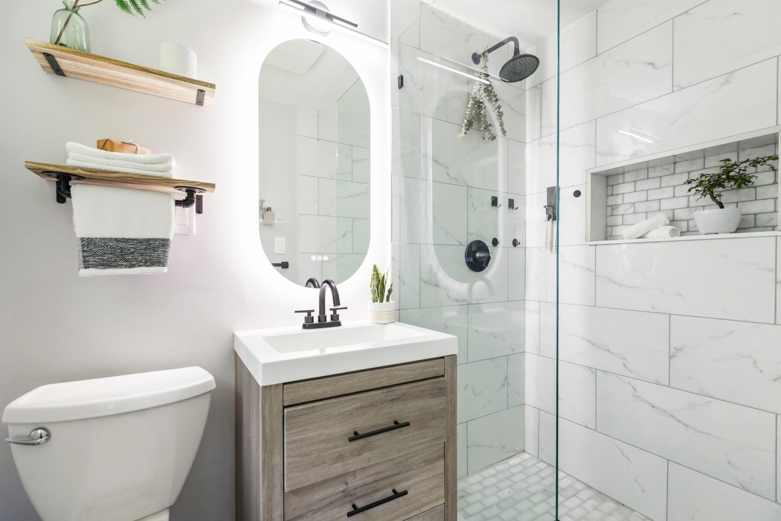 Pegue o corredor entre as áreas de estar e jantar. Primeiro, à direita, está o banheiro principal completo, que oferece uma única pia com pia de cerâmica, piso de cerâmica e uma combinação de banheira/chuveiro de chinelo duplo branco com um backsplash de cerâmica que imita mármore.