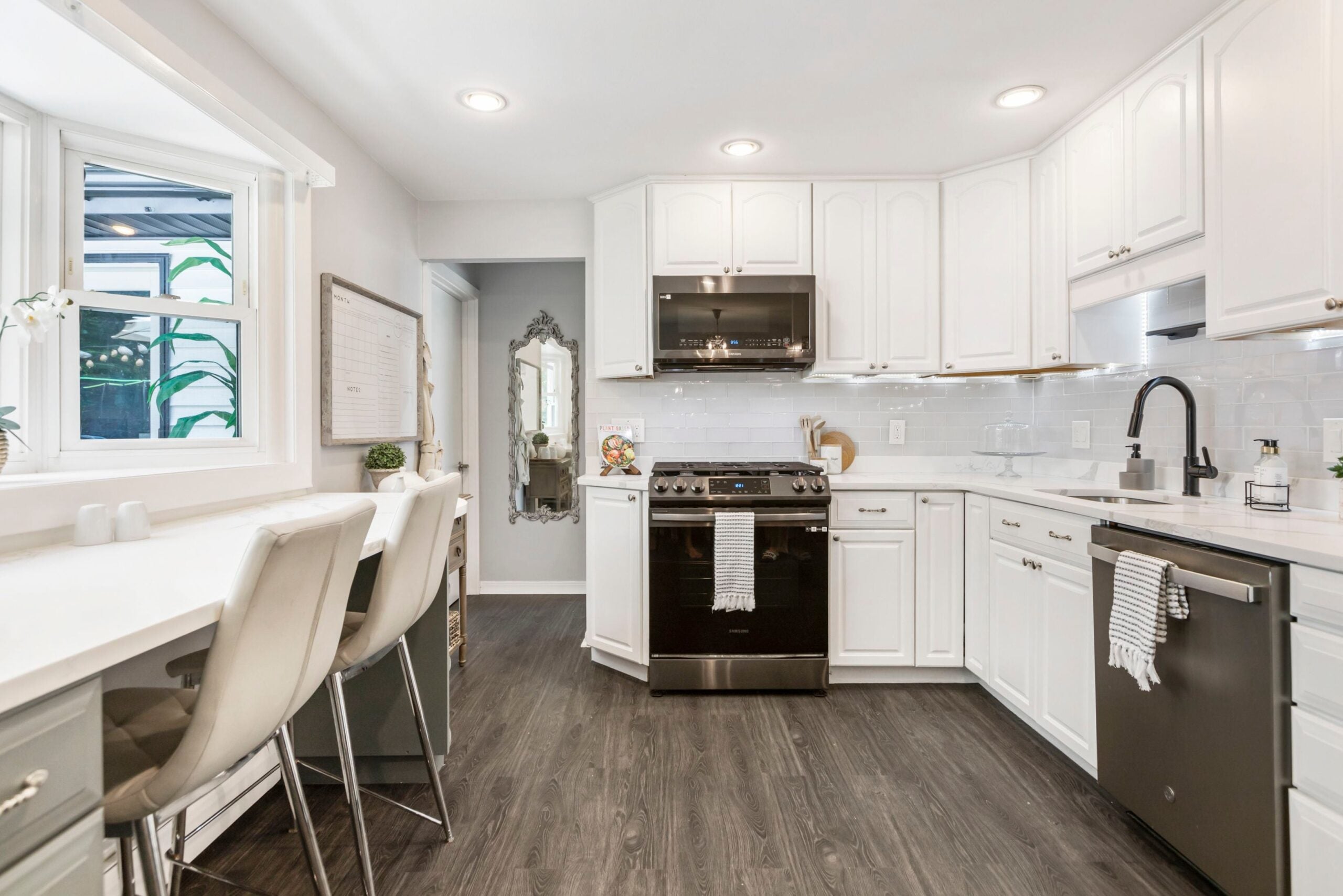 Não é de surpreender que a área de jantar seja aberta para a cozinha de 132 pés quadrados. Este espaço é um estudo em branco, dos armários de painel elevado às bancadas de quartzo e ao backsplash de azulejos de metrô de vidro. Outros destaques incluem iluminação embutida e sob o armário, eletrodomésticos de aço inoxidável (o fogão é a gás) e um longo balcão/mesa de café da manhã diante de uma janela saliente com vista para o quintal.