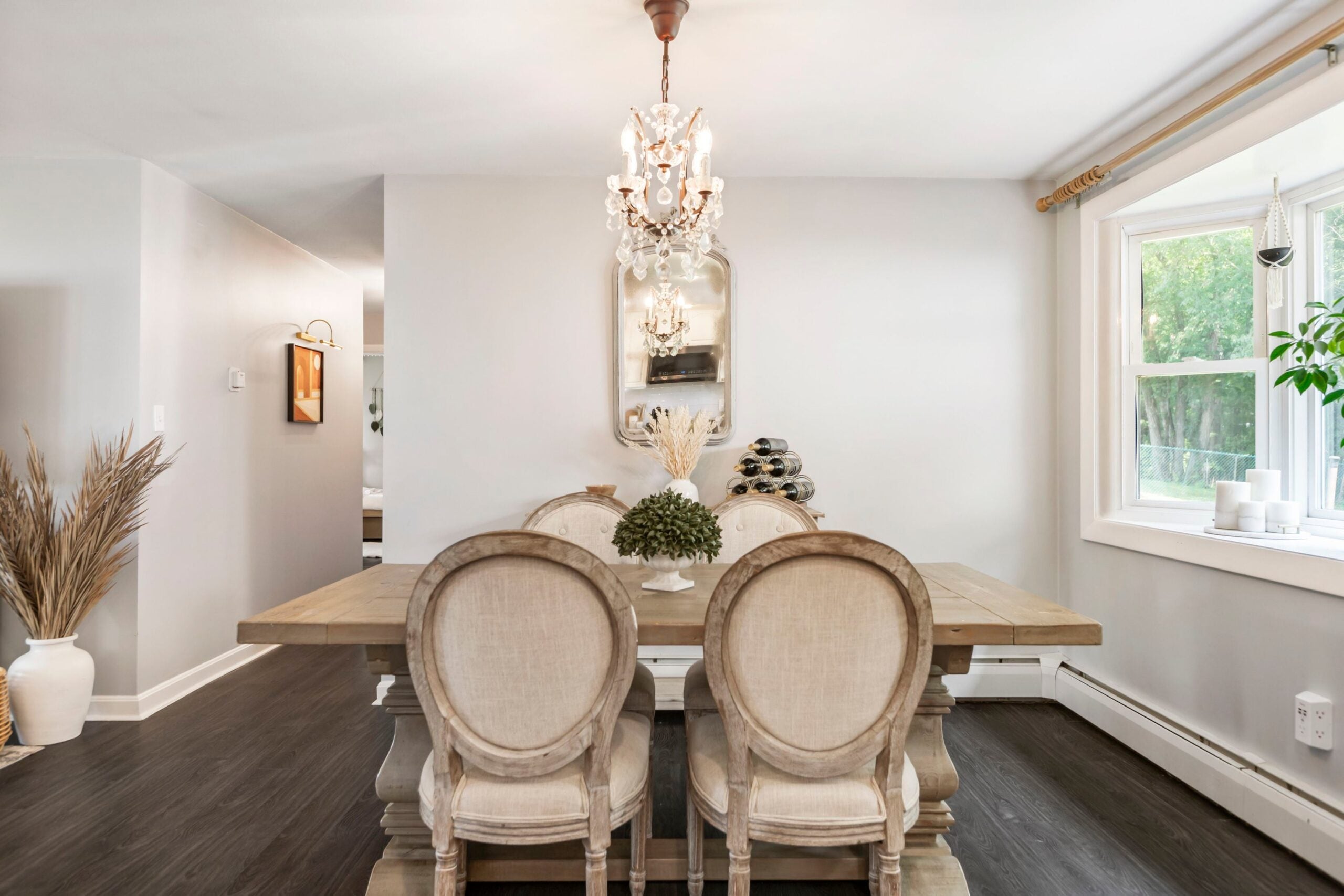 A sala de estar é aberta para a área de jantar de 10 metros quadrados, onde uma mesa de cavalete para seis pessoas fica sob um lustre de cristal que evoca imagens de pingentes de gelo banhados pelo sol.
