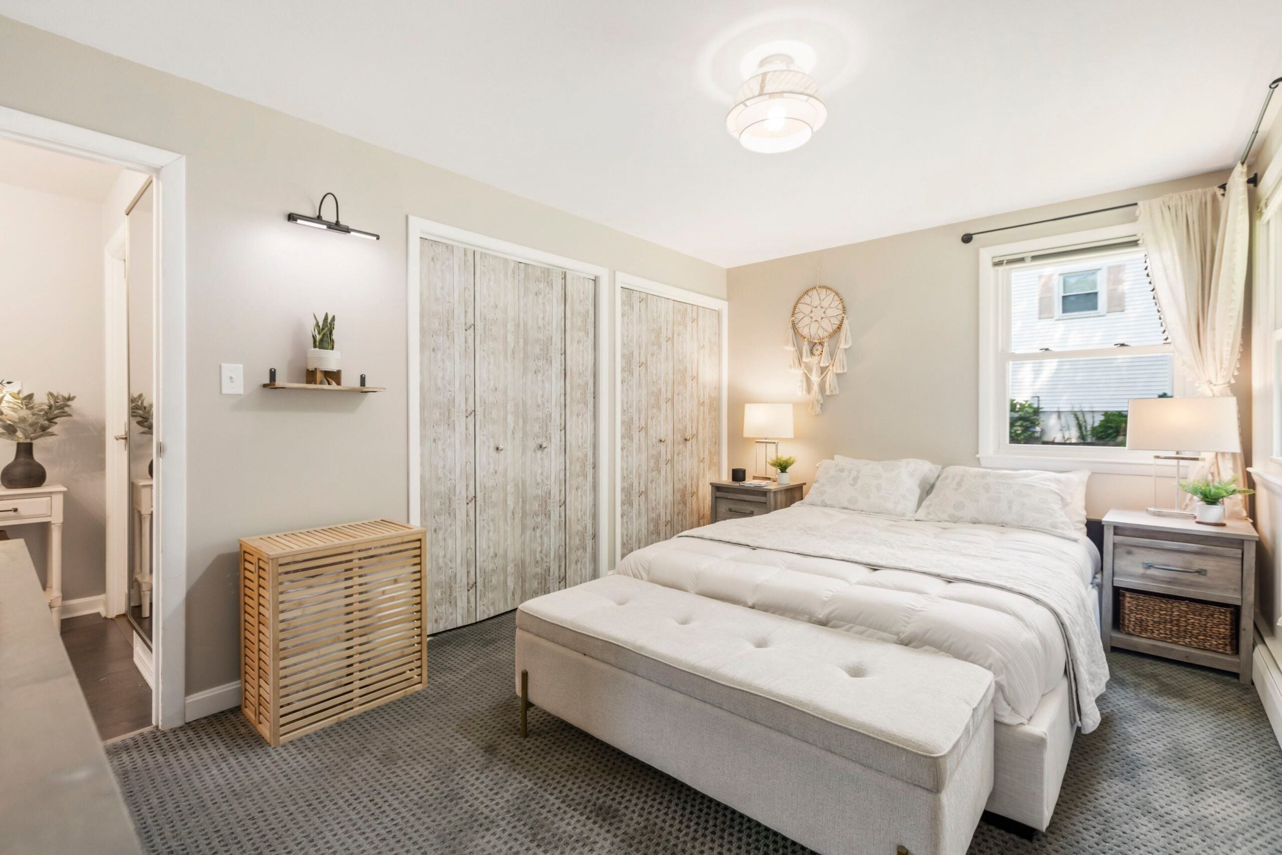 A suíte principal fica aninhada nos cantos mais distantes da casa, no canto esquerdo. Tem 150 pés quadrados e tem uma bela luminária cilíndrica, carpete, armários duplos dobráveis com apliques de designer de bétula e janelas de canto. O banheiro privativo oferece uma pia única com tampo de cerâmica. Você encontrará ladrilhos de cerâmica no chão e no entorno do chuveiro, mas o box do chuveiro é coberto de mármore.