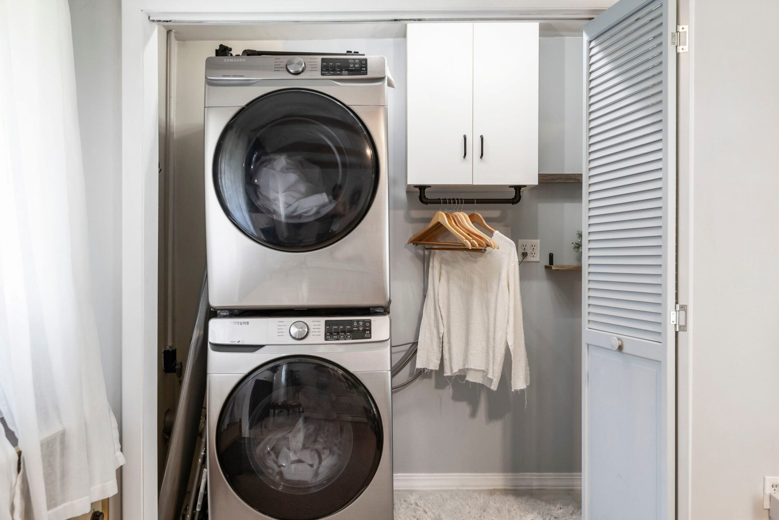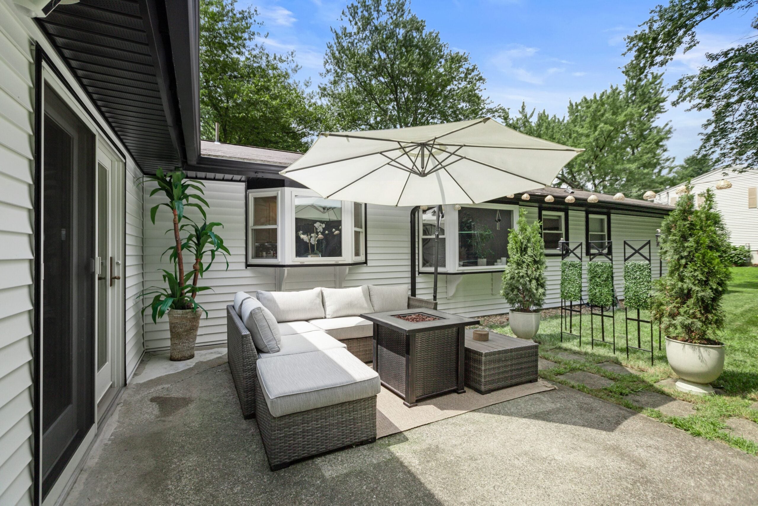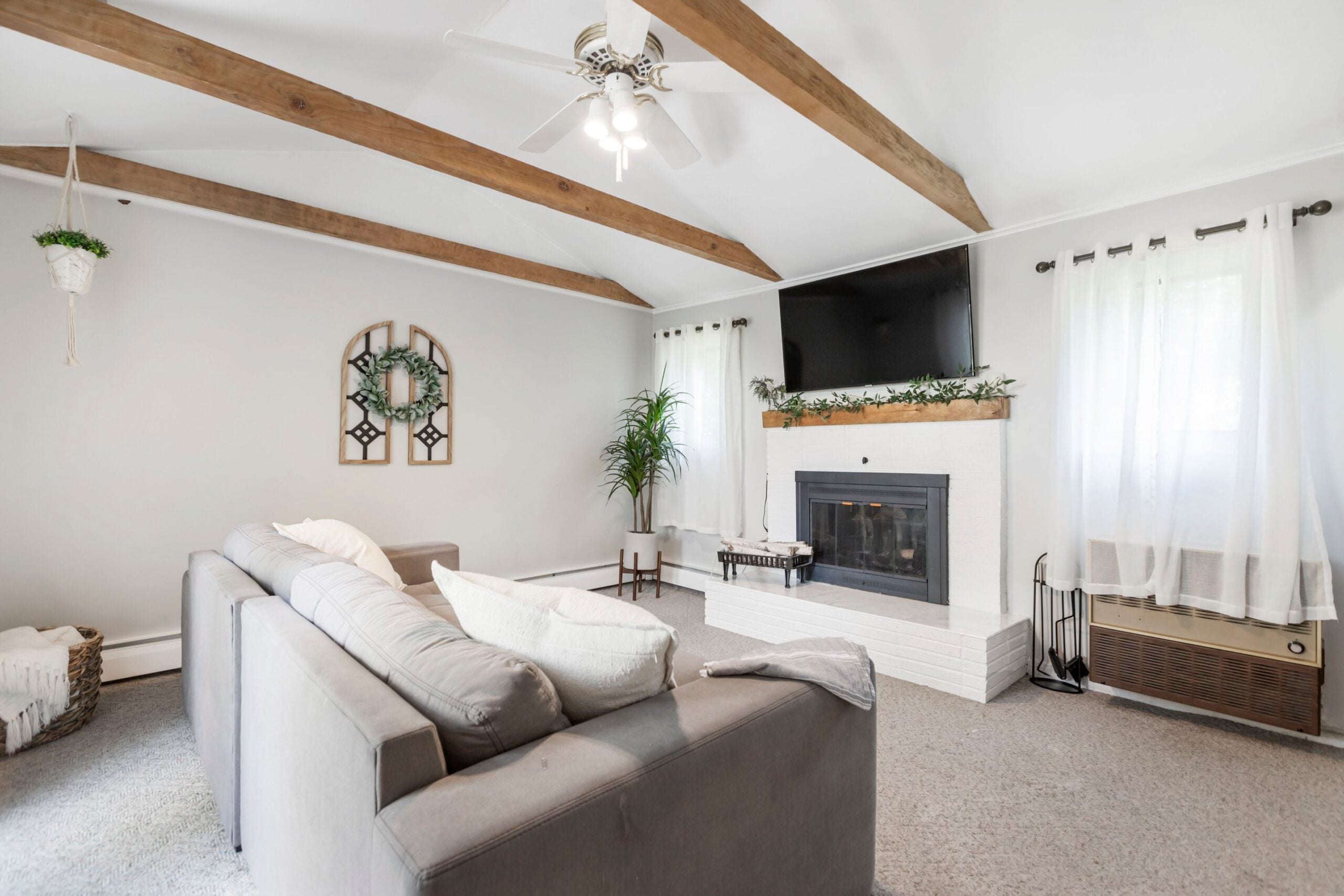 Um corredor da cozinha conecta-se à garagem e à sala de estar acarpetada (182 pés quadrados). É retangular, como seria de se esperar em um rancho, mas oferece um toque rústico mais comum em casas de estilo fazenda: vigas expostas. A sala de estar tem outro atrativo: uma lareira de tijolos a lenha que foi pintada de branco e coroada com uma espessa cornija de madeira. Uma porta se abre para o quintal do lote de 0,41 acre, e portas com venezianas se abrem para revelar um armário de lavanderia com eletrodomésticos empilhados, armários, um cabideiro e prateleiras abertas.