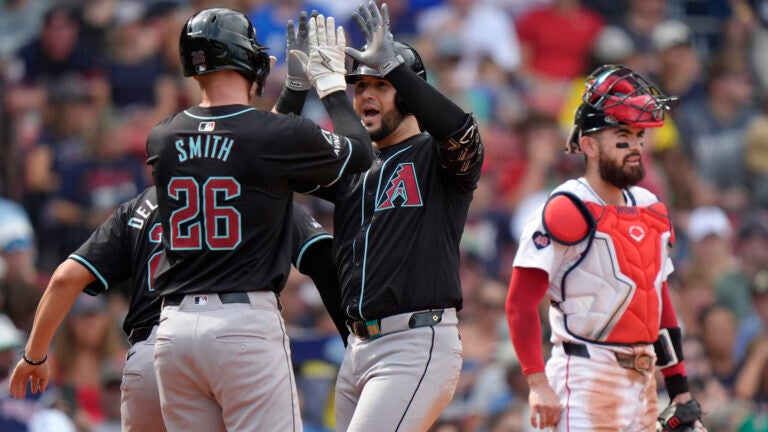 Eugenio Suárez, do Arizona Diamondbacks, no centro, comemora após seu home run de três corridas com Pavin Smith, à esquerda, perto do receptor do Red Sox, Connor Wong, à direita, no sexto inning. Foto AP/Steven Senne