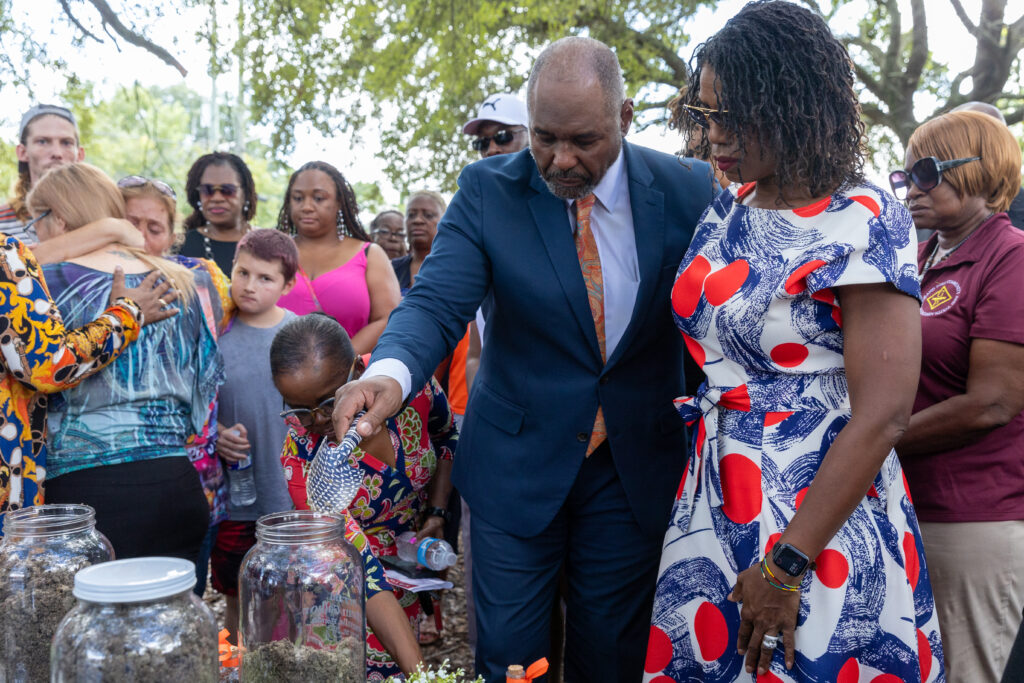 “Linchamentos por terror racial foram crimes projetados para incutir medo nos corações das comunidades negras e suprimir direitos civis”, disse Rudnick. “O JCRP reconhece os assassinatos da Dollar General como incidentes de linchamento por terror racial e estamos aqui para realizar o ritual sagrado de coleta de solo reunindo solo trazido da frente da loja Dollar General e colocando-o em potes com os nomes de AJ Laguerre, Angela Carr e Jerrald Gallion. A coleta de solo é uma maneira de nos conectar através do tempo aos homens e mulheres que perderam suas vidas.”