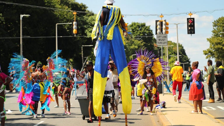 O desfile anual do Caribbean Carnival Parade foi realizado na tarde de sábado, enquanto os participantes seguiam pela MLK Blvd. e Warren Streets até o destino final do Franklin Park. Um homem fantasiado anda sobre pernas de pau pela MLK Blvd. John Tlumacki/The Boston Globe