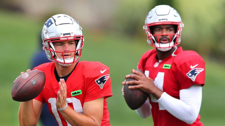 Drake Maye e Jacoby Brissett no início do campo de treinamento dos Patriots. John Tlumacki/Equipe Globe