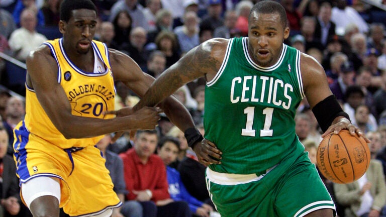Glen Davis, do Celtics, acerta a bola e passa por Ekpe Udoh, do Golden State, durante um jogo de 2011 em Oakland, Califórnia. AP Photo/Ben Margot, Arquivo