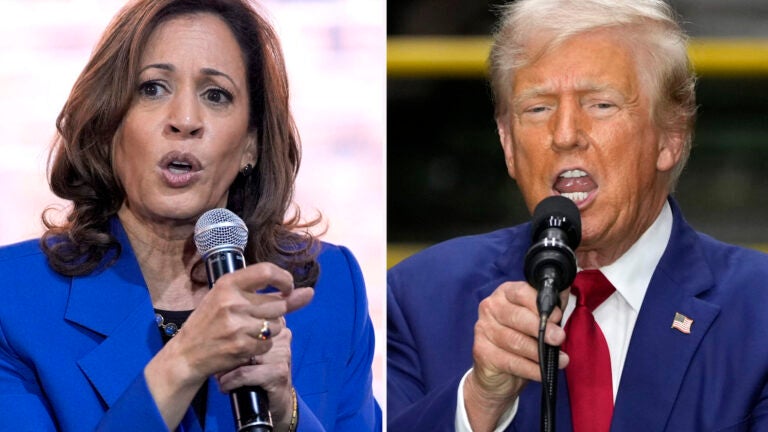 Nesta combinação de fotos tiradas na Pensilvânia, a candidata presidencial democrata, vice-presidente Kamala Harris, discursa em um evento de campanha, em 18 de agosto de 2024, em Rochester, à esquerda, e o candidato presidencial republicano, ex-presidente Donald Trump, discursa durante um evento de campanha, em 19 de agosto de 2024, em York. Foto AP