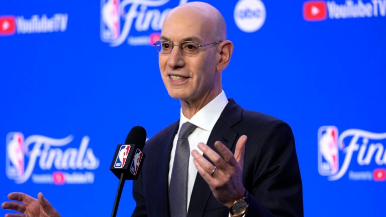 O comissário da NBA, Adam Silver, fala com repórteres antes das finais da NBA entre Celtics e Mavericks. AP Photo / Charles Krupa, Arquivo