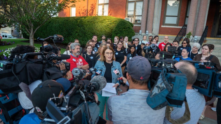 A copresidente da RTA, Jane Chapin, fala com a imprensa antes de uma reunião do Conselho Municipal na segunda-feira, 9 de setembro. Associação de Professores de Massachusetts