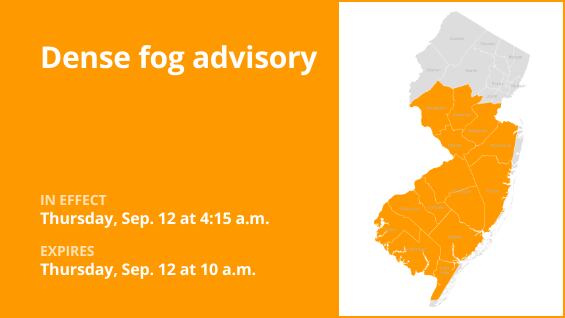 Um alerta de neblina densa foi emitido pelo Serviço Nacional de Meteorologia na quinta-feira às 4h15, com vigência até 10h para os condados de Hunterdon, Somerset, Middlesex, Monmouth, Mercer, Salem, Gloucester, Camden, Burlington, Ocean, Cumberland, Atlantic e Cape May.