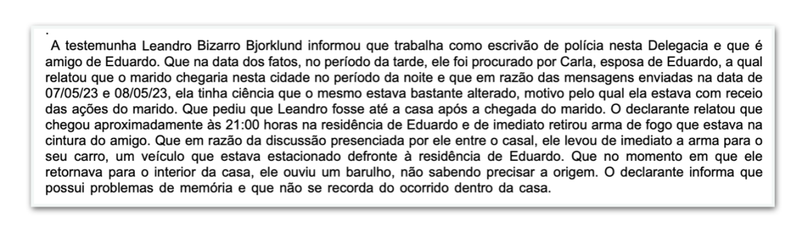 O escrivão Leandro Bjorklund é amigo próximo de Tagliaferro. Ele foi testemunha de defesa quando o ex-assessor de Moraes foi preso por violência doméstica contra sua ex-mulher em maio de 2023. Leia abaixo um trecho do boletim de ocorrência: