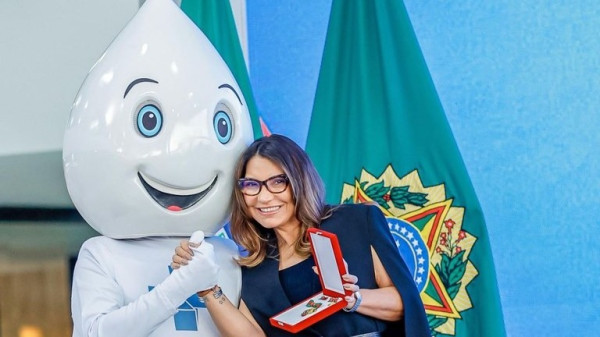 Nísia entregou a medalha à Janja que, em seguida, posou para fotos com a condecoração ao lado do mascote da vacinação no país, Zé Gotinha.