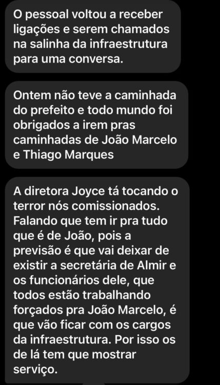A pressão é maior em favor de João e, segundo o relato, uma pessoa identificada como Joyce estaria “tocando terror” porque a secretária de uma pessoa identificada por “Almir” vai deixar de existir e que os servidos desta pasta, que estão sendo forçados a trabalharem por João, ficarão com as vagas.