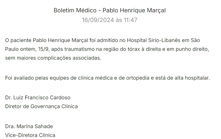 “O paciente Pablo Henrique Marçal foi admitido no Hospital Sírio-Libanês em São Paulo ontem, 15/9, depois de traumatismo na região do tórax à direita e em punho direito, sem maiores complicações associadas”, diz o documento, assinado pelo diretor de Governança da unidade, Luiz Francisco Cardoso, e pela vice-diretora clínica, Marina Sahade.