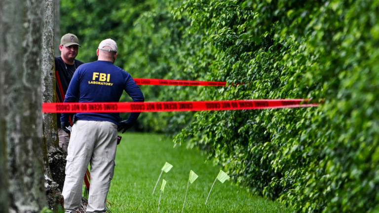 Membros do FBI são vistos na cena do crime do lado de fora do Trump International Golf Club em West Palm Beach, Flórida, em 17 de setembro de 2024, após um incidente de tiro no campo de golfe do ex-presidente dos EUA Donald Trump. Em 16 de setembro, as autoridades acusaram um homem suspeito de conspirar para assassinar Donald Trump com crimes federais de armas de fogo. (Foto de Chandan Khanna/AFP via Getty Images)